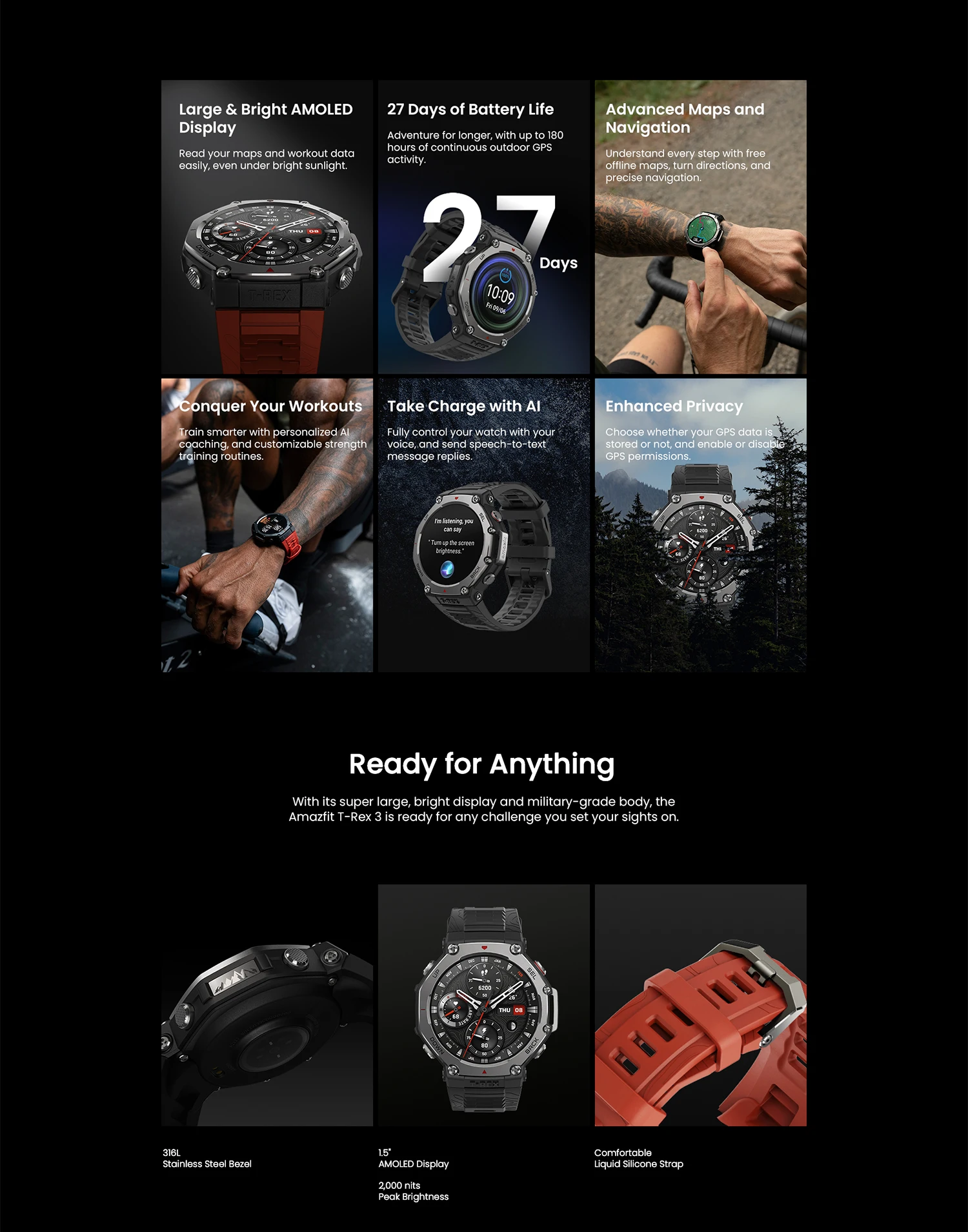 【Proteção de privacidade aprimorada】O smartwatch Amazfit T-Rex 3 oferece proteção de dados de alto nível dos Serviços da Amazon Web, garantindo a conformidade com o choque. Assuma o controle total da sua privacidade ao optar por ativar ou desativar o armazenamento de dados GPS.