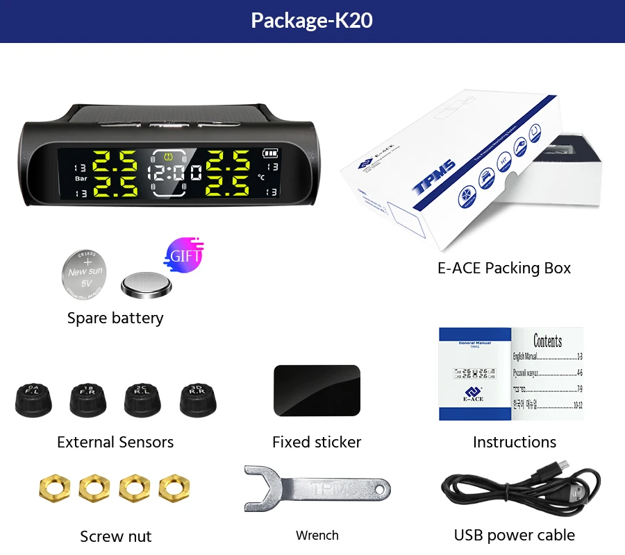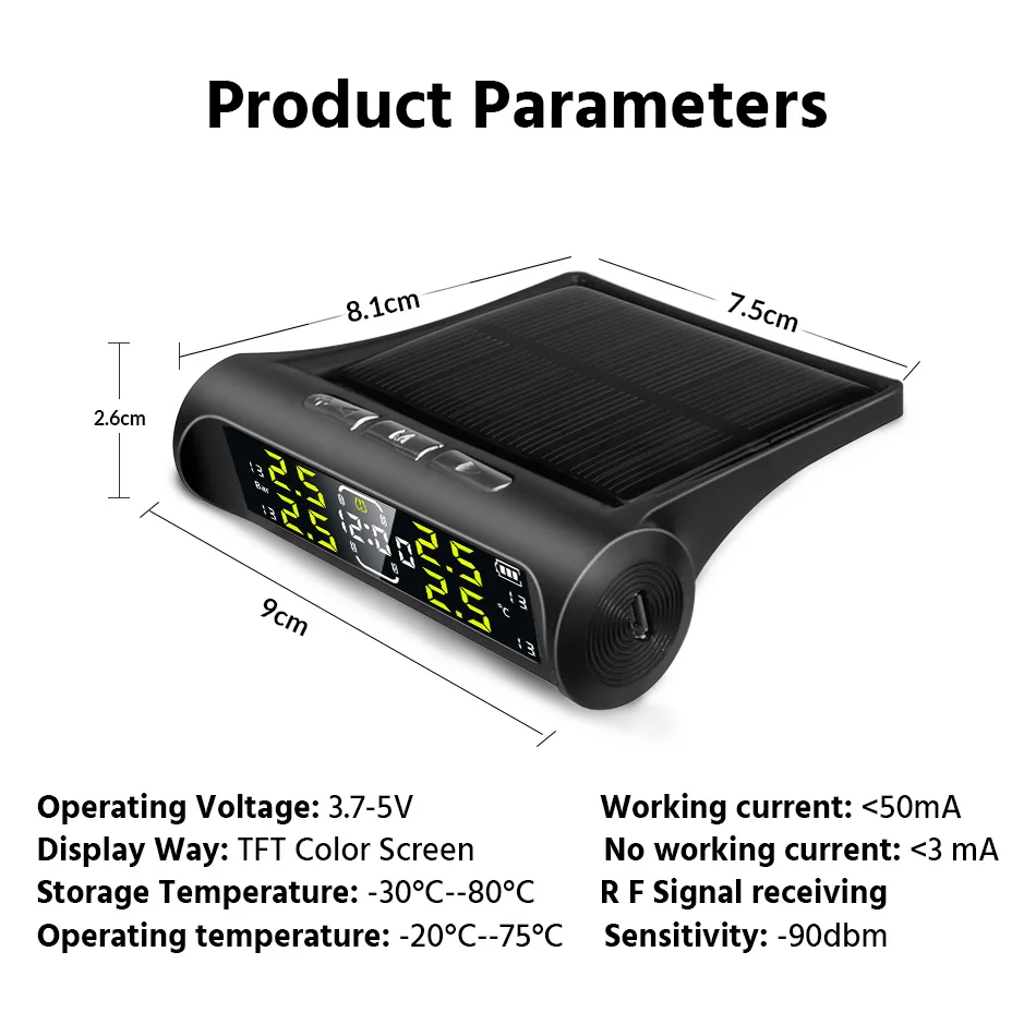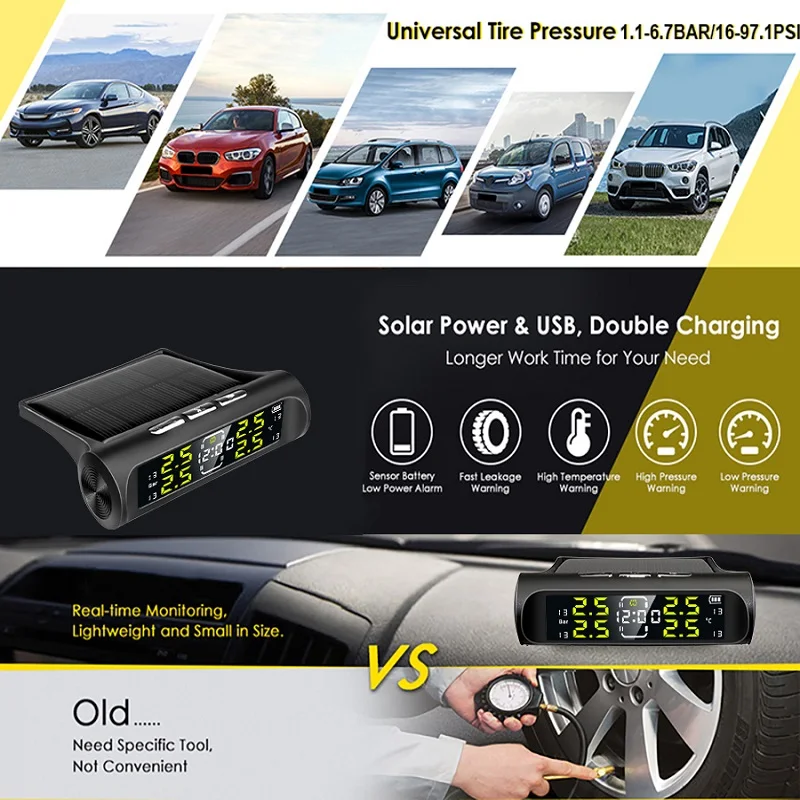 Carregamento solar inteligente de pressão dos pneus do carro TPMS + carregamento USB