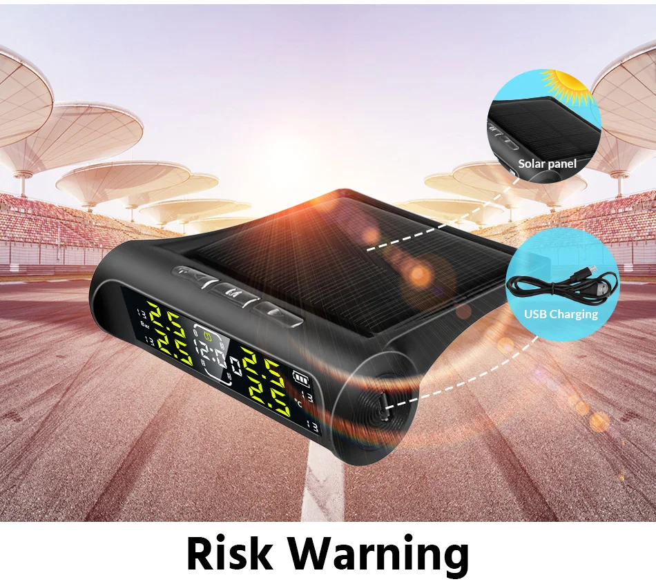 Carregamento solar sem fio TPMS Monitoramento em tempo real com display de relógio eletrônico 4 sensores Sistema de monitoramento de pressão dos pneus